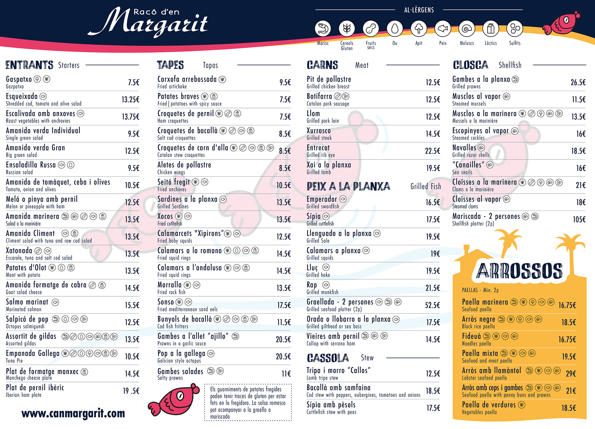 En el chiringuito de Can Margarit encontraréis una extensa carta con opciones para todo el mundo, tanto grandes como pequeños. Tenemos tapas y raciones, ensaladas, arroces y platos de carne o pescado. También nos podéis llamar al 93 790 61 01 para preguntar por nuestros menús para grupos, que adaptamos a vuestras necesidades.